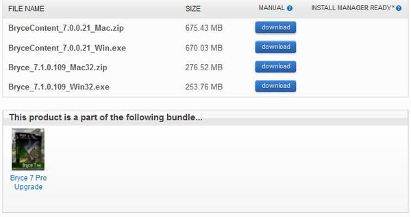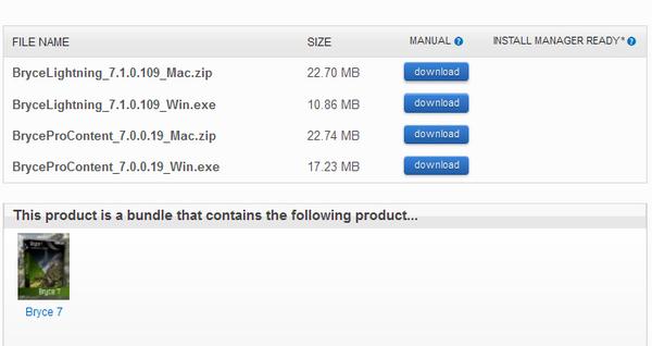 Thanks for the reply. I'm not using the Daz Installer cause the Bryce files don't show up, just the Daz Studio stuff.. The only Bryce files on Daz's site are the Bryce Lightning and the Bryce Pro Content, I don't see the "Bryce_7.1.0.109_Win32.exe" or "BryceContent_7.0.0.21_Win.exe". Thanks!