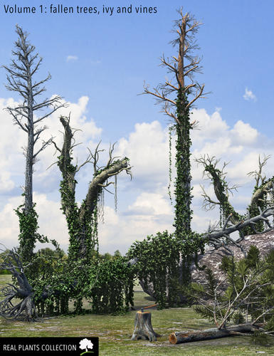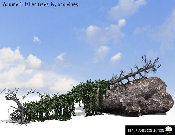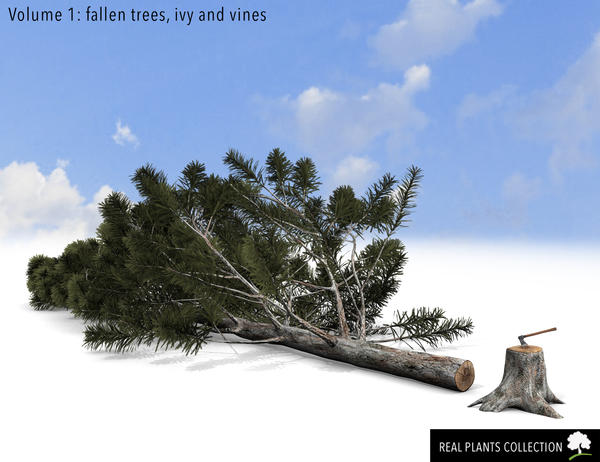 Here comes the first volume of the Real Plants Collection named "Fallen Trees Ivy and Vines", which includes a set of 12 different trees, some covered with ivy and vines, other laying on a rock or sawed, a stump and an axe.