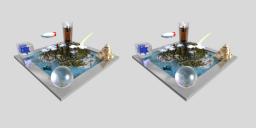 For those that don't have the red/cyan glasses or have impaired colour perception, here the ALS has been converted to display two images side by side. Left image is displayed on the right and right on the left. To perceive as a 3D image you need to focus your eyes somewhere between your nose and the screen until the two images converge to form a third image in the middle. I find this going cross-eyed very uncomfortable (even if sitting a long way from the screen) and much prefer the colour separation method. However, since someone asked if it was possible, I thought I'd make it possible. Here we are, once again in one render with no postwork. All the work being done by lenses and mirrors bolted (parented) onto the front of the perspective camera. Again, this is experimental, so feedback is welcome.