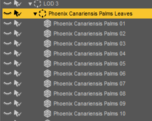 @Granville, For future reference, when you hide a group, all of the groups and objects within the group will remain hidden. The "LOD 3" in your image is a group. So is the "Phoenix Canariensis Palms Leaves". Until I figure this out, it drove me crazy that I couldn't get the visisbility "eye" to open!