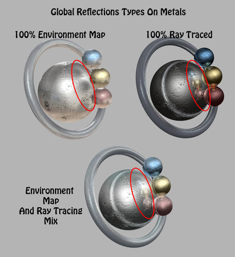 Drawback 2 : by using environment maps, your reflections become totally independent of your real surrounding props / figures / skies / environment. Which means that if you want an element of the scene to be reflected on your metal, this becomes impossible. Because the reflections of these types, the ones which reflect the real props are driven by "ray traced reflections".