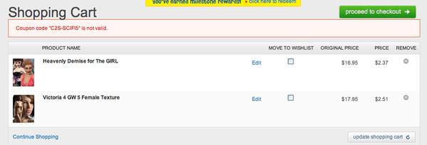 whoa, I got some store credit that I did not expect. Which means that DAZ for the first time in forever found a problem that I missed. I'm not sure how I should feel about this...either DAZ is getting better or I am getting jaded and just don't bother anymore.