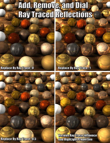 All the shaders I made have been build "around" the DAZ default material, so that users can find a maximum of inputs, dials, behaviours, they are used to. And for all of them, the fundamental features of wood and metal materials characteristics have been "modified in" and/or "added to" the default material in order to have them more realistic and customisable than ever, by for instance but not only, the use of BRDFs in specular to get more control over the highlights shapes, the possibility for the metal to include several levels of material defects, the possibility to mix map reflection and ray tracing in an adjustable way, to force reflections, the use of separate tiles, model switchers for woods...