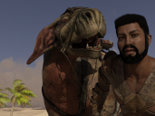 Here's my test render of Ashan, but using the Ytar texture for skin and eyes, Abasi beard and brows, and Baby Locks hair. Pose is one of Underbelly's. Also used Auto Muscle Enhancer set to a minimum level, but with AME Veins set to a moderate level. Did a few minor tweaks to ear lobes and eyes. Ran the render through Photoshop for contrast/color enhancement and cropping.