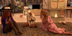 If you are looking in the set for the pose on the left, you won't find it. That pose (with a few adjustments by me) comes from the 50 Advanced Seated Poses set, which includes a few floor poses. I've also applied the wearable partial poses presets from Fancy Cocktails Wearable Poses to the 3 ladies.