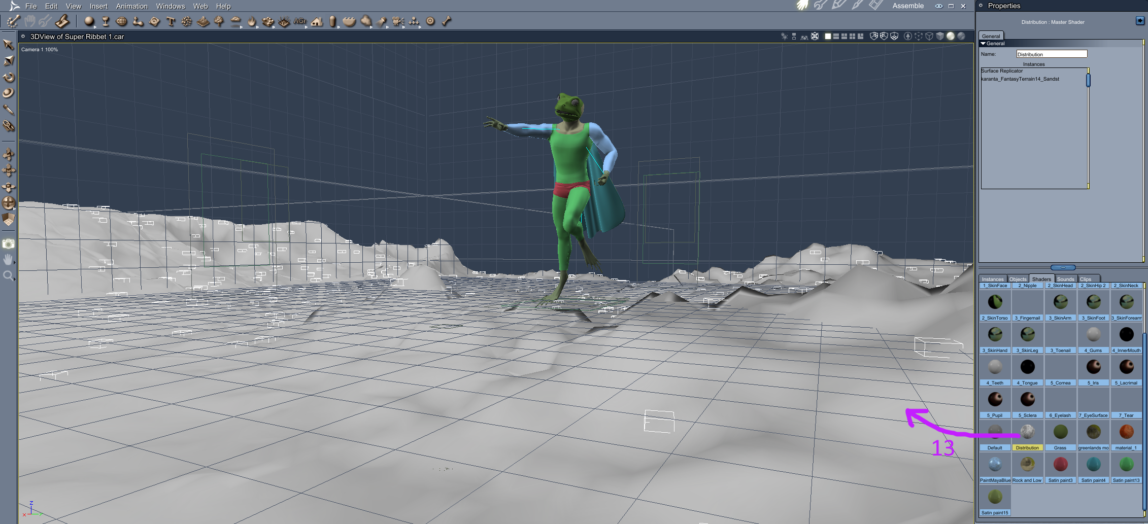13. Back in the Assemble room, applied the Distribution shader to the terrain.