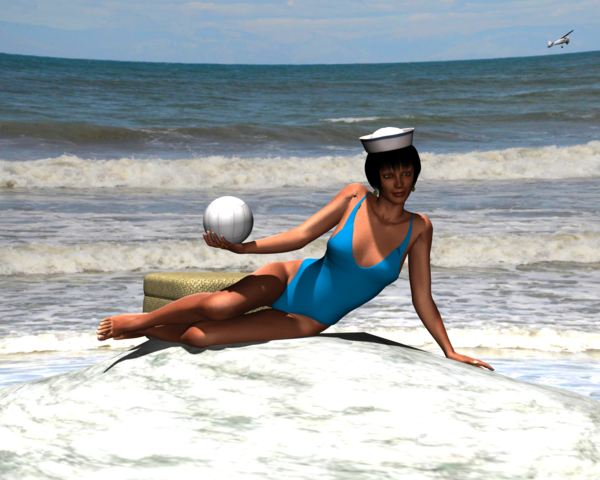 "WATCHING THE WATCHER" - CathyM. This entry covers every aspect of what this theme is all about. Summer fun and pinups. The kids, the two lovely ladies, the hunk lifeguard...all of it. The scene setting is fun. If you go to the gallery and click this render to full size, you will see an incredible depth of field effect on it. I just think this entry is a perfect example of the theme. Colors, lighting, setting, characters, props, all of it. Congratulations CathyM for a superior render entry. It is our number one winner.