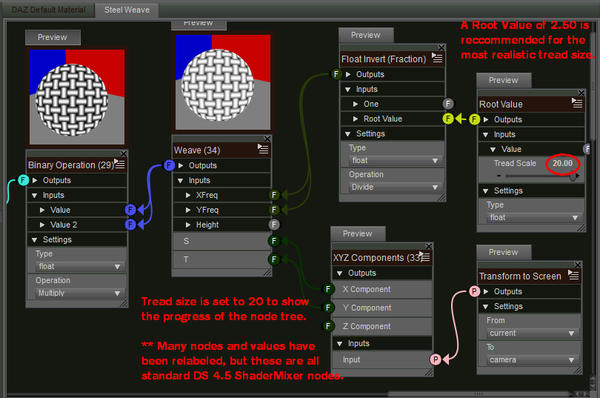 This is the node walk-through. I got the color values more-or-less from Lakys' still-splendid Blue Steel shader (circa DS 1.8 or so). Except for the Root Value change, as noted, this is the shader I used on the deck-plate dress on page 2 of this thread. I'm still fine-tuning it but hope to have it on ShareCG by the weekend. Some nodes and values are relabeled, but hopefully recognizable: "Transform to Screen" is a standard Transform node, but it's set to transform to Camera.