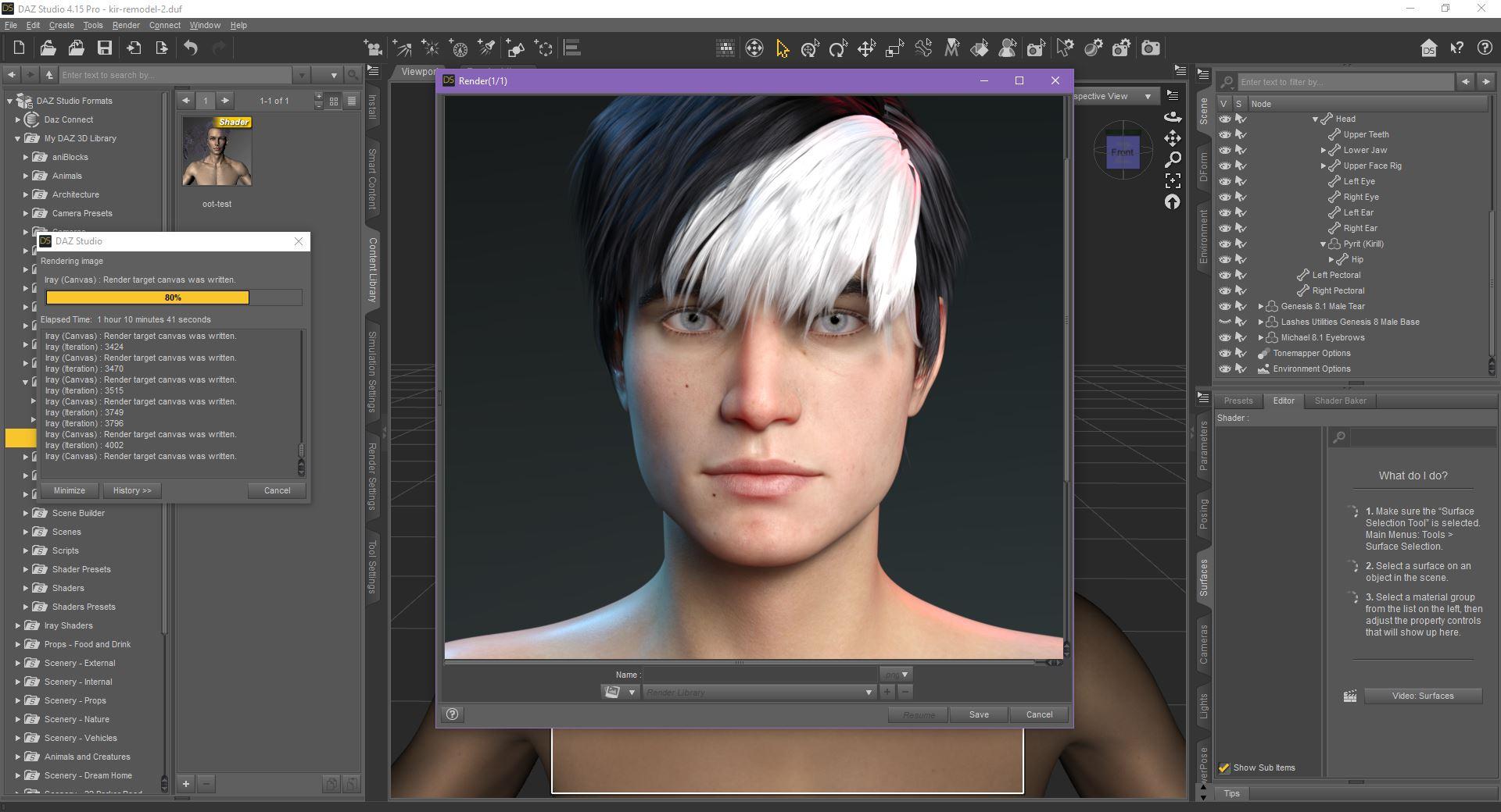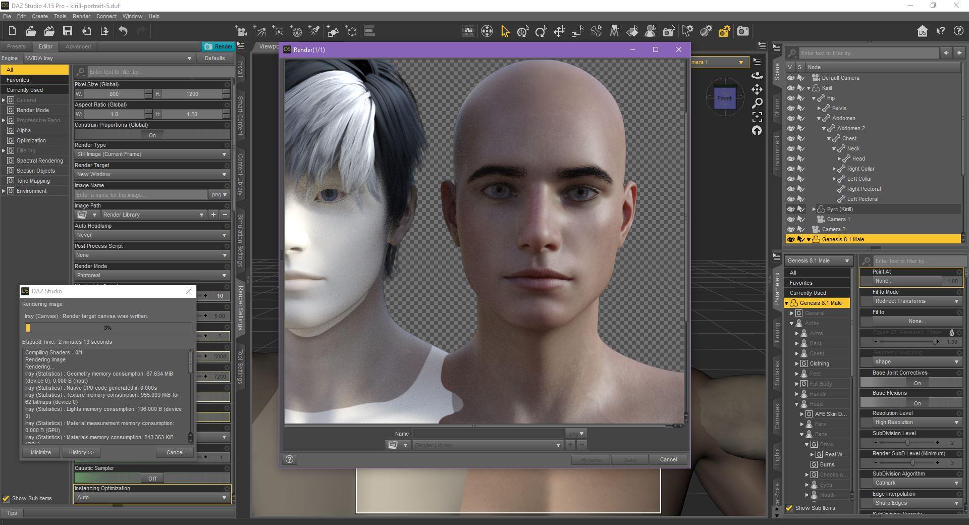 But when I opened this really old file with Genesis 1 Kirill in 4.15, then added a G8.1 to try moving the character over, and then render both G1 and G8 in the scene together, one of which has hair, the other has fibre brows and eyelashes...