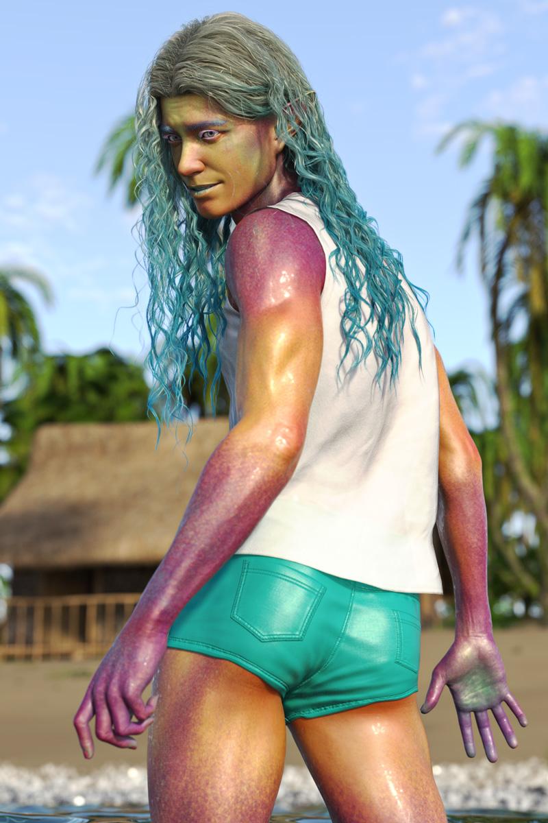 And a pinup back on his homeworld (whoever HE is *glares at him*), because I do like a good pinup. I'm really happy Sue Yee included a masculine fit for these shorts in the Cool Summer Set, they go together nicely with the T-shirt from the Sunny Road outfit (grabbed a while ago on discount and mugged slightly with dForce here, not that it thanked me for it), and I really like how the Wet Style Curly Hair renders... and that it has colours that match him already set up.
