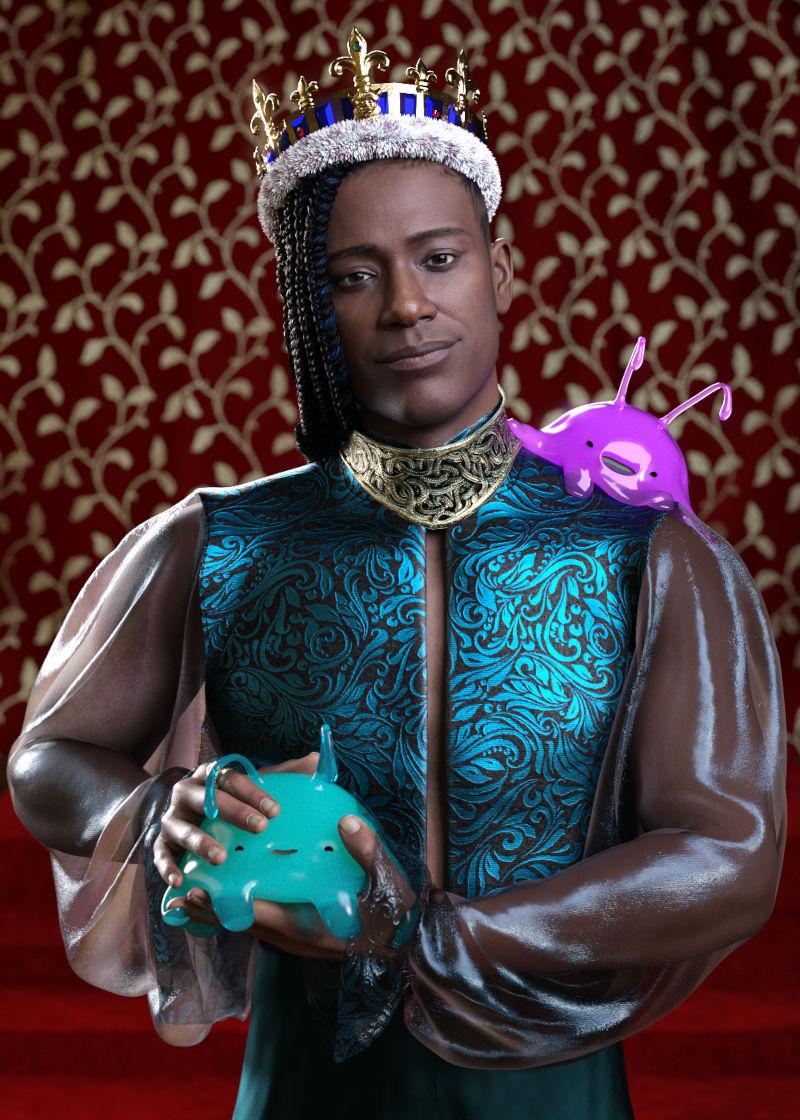 I picked up Lawrence because he was just far too handsome not to, and since I'd also got the Kawaii Alien Slime, clearly both needed to be combined. (The only thing that would make these guys even cuter is if they bent in the middle, because getting that one perched on his shoulder was surprisingly difficult. They do not want to drape.) Jumbo Side Braids conform really nicely to G9, and the crown came from, of all things, Neftis' Historical Curls from 2012. A couple of updated shaders and it still looks great! And obviously, a handsome king with his cute pet slimes needed a suitably regal outfit, so it was the perfect opportunity to play with dForce Milo Clothing and Black Forge Accessories.