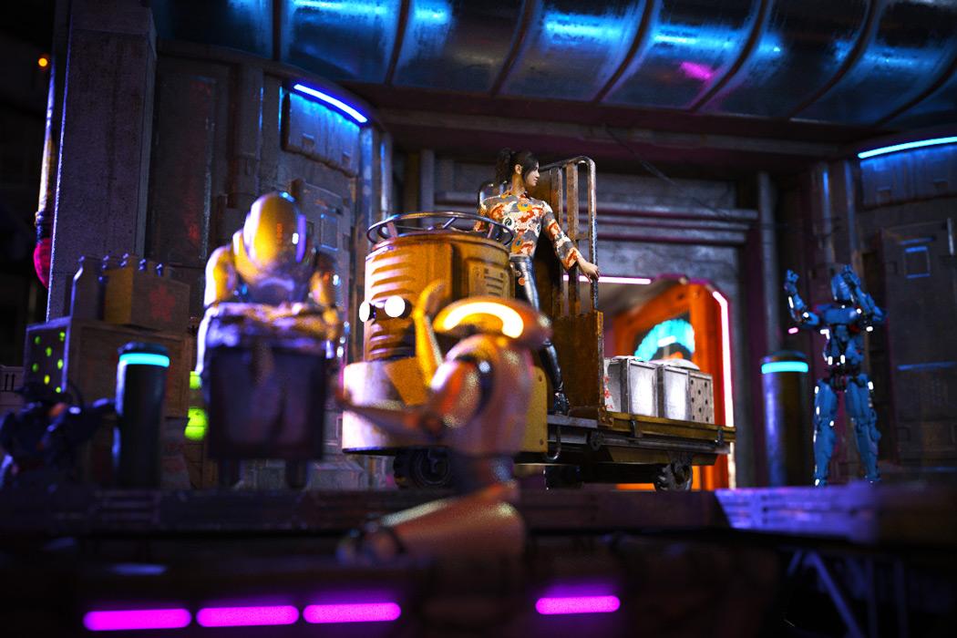 And then, when trying out the Spaceship Jumpsuit Outfit, he suddenly ended up meeting Alien Elf Guy, dressed in his Worker Uniform and Texture Addon from previous shenanigans. Testing out the AK Punk Hair, which looks good long even if you push it past its limits. Also finally rendering the Cyber Garage and the Dystopian Garage addon, which for some reason was an absolute pain to light.