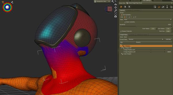 Helmet.... well the head bends back and forth, side to side and twists... Right now I'm doing the bend too and fro. I've got just one X-Rotation map in the neck and just added a "left Bulge Map" because I don't think I'm going to need a right one so far. I figure I can get most of the bend set up in the X-Rotation map and use the "left Bulge map" to get things squared away with any poke throughs I might get either Too or Fro... Nope, not that easy for me so far.