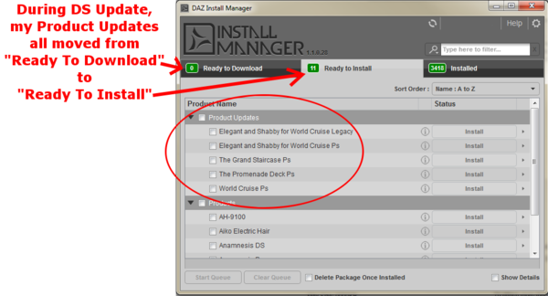 I usually install all updates immediately myself. However, I have just completed an update for DS through DIM and all of the product updates in my "Ready To Download" tab disappeared. I noticed the number count on my "Ready To Install" tab had increased and there they were. They must have downloaded automatically with my DS upgrade and were moved to the other tab.
