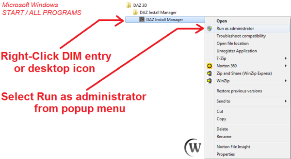 Find the DIM icon on the desktop or in the Start / All Programs listing and right-click on it and select "Run as administrator"