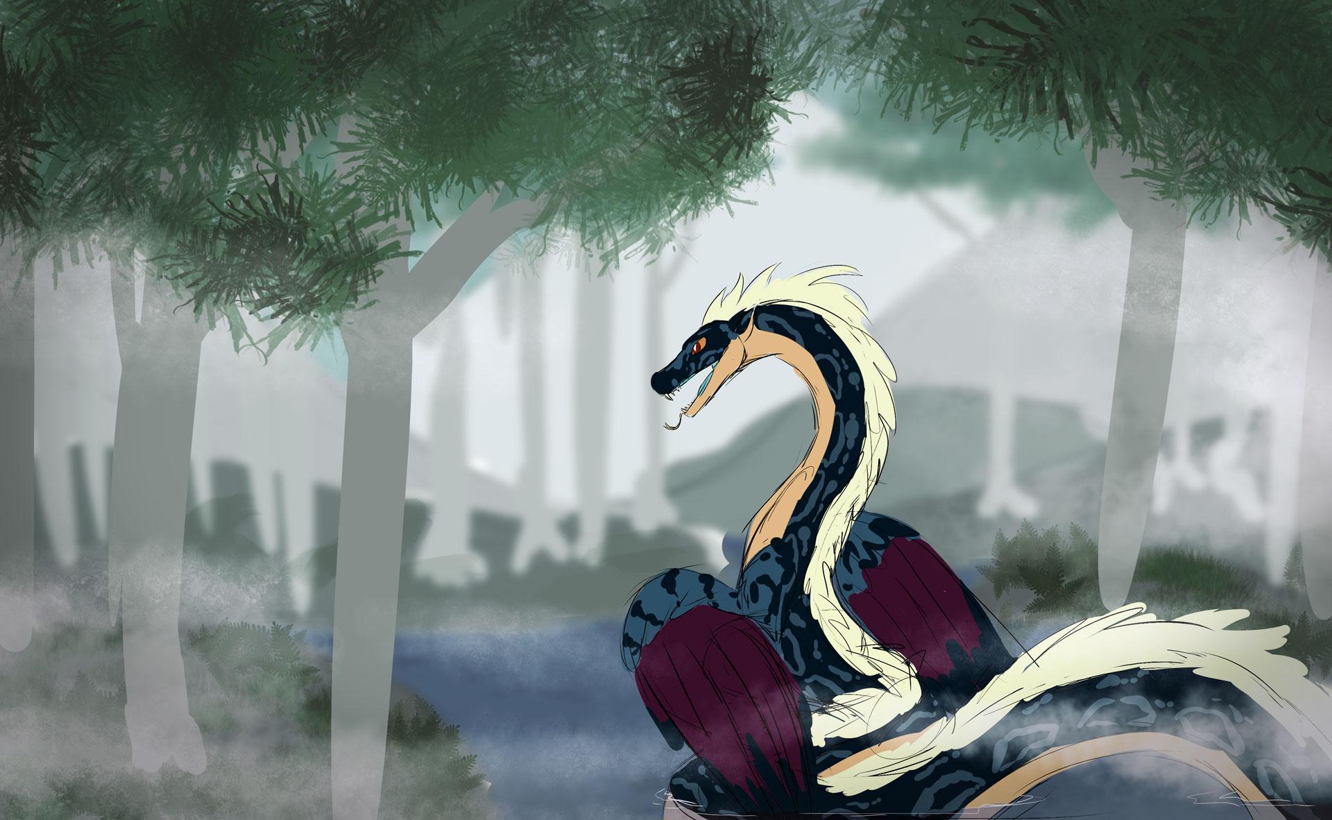 Working on a drawing atm.  The sort of thing I'd normally use some 3D to help out with but I ended up just sketching it up all off the top of my head.  I wanted to draw one of my coatls running a shop of some kind for a long time now and finally started on it :>