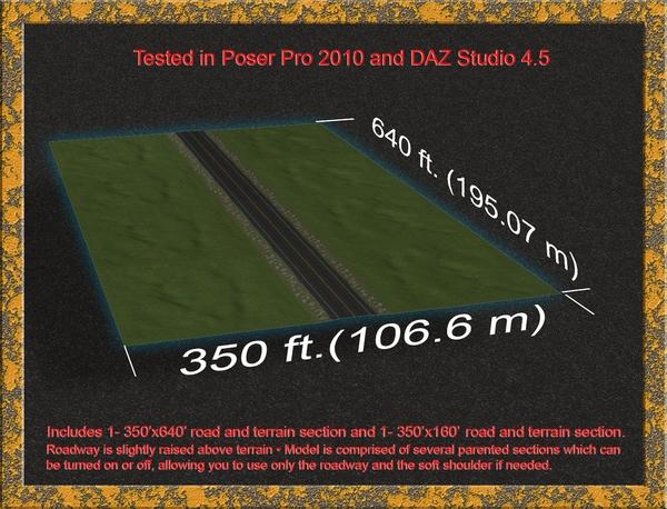 The roadway itself is about 40 ft wide (12.192 M) with a soft shoulder (semi-paved/semi dirt area next to actual road) of about 13 ft (3.962 M) on each side the rest of the 350 ft is just simple sculpted terrain with a grassy texture applied (nothing to fancy, but if you throw some 3D weeds on it, it'll do)... The roadway is slightly elevated above the surrounding terrain...