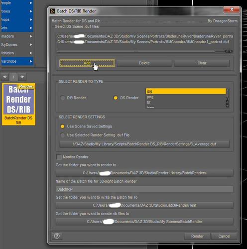 You then select the render type. RIB render is for the stand alone 3Delight. For a DS render you select JPG, PNG, TIF or BMP.