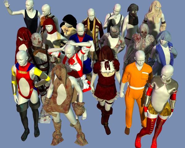 I thought I'd make an image that has all my finished outfits to date in it but quickly discovered that my poor meagre laptop simply doesn't have what it takes to handle that many polygons at once so I had to give up partway through my catalogue because it became too slow and tedious to move the stuff around my screens. So I rendered what I could at once and noticed something weird in the render.