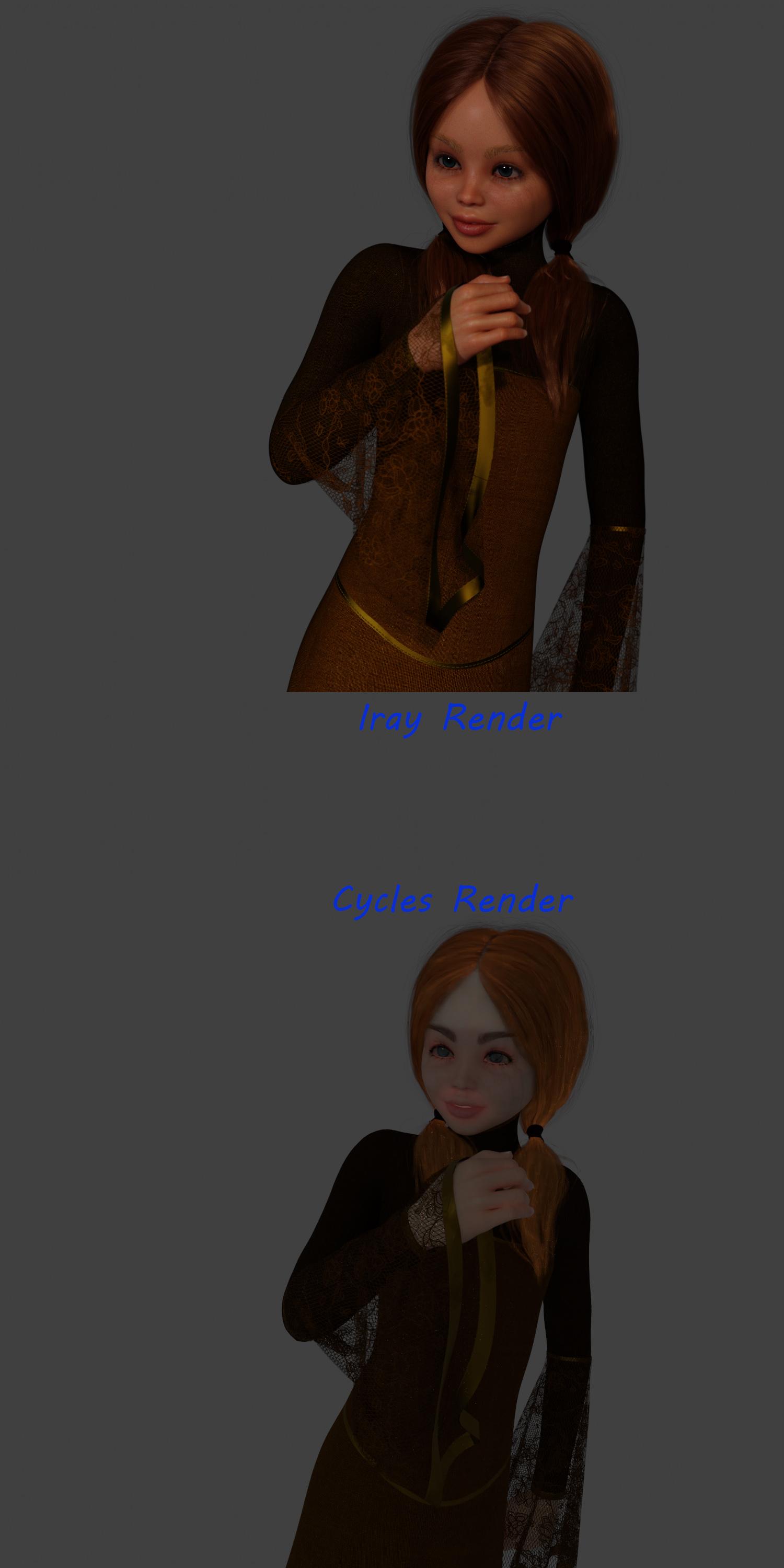 I really like the hair in the Cycles render. The eyes do look better in Iray and the skin looks different but ok in both render engines. Good job!