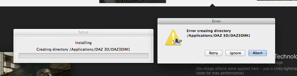 If you in the folder Applications, in the folder DAZ 3D select the folder DAZ3DIM1 and then hit Apple-I (Get Info), At the bottom of the Info panel is a list of Sharing and Rights, whatb user is at the top and what rights does it have?