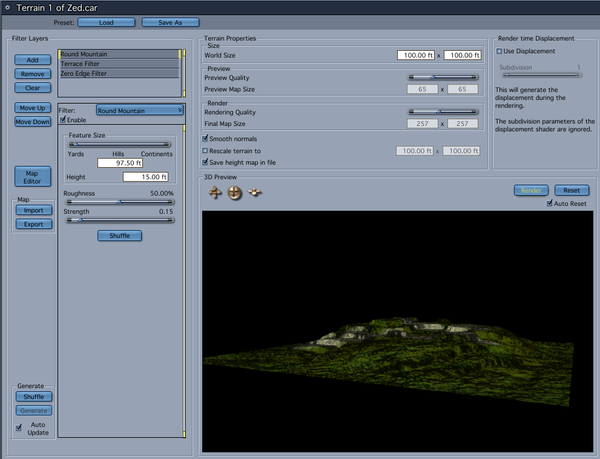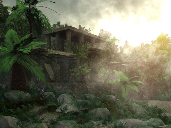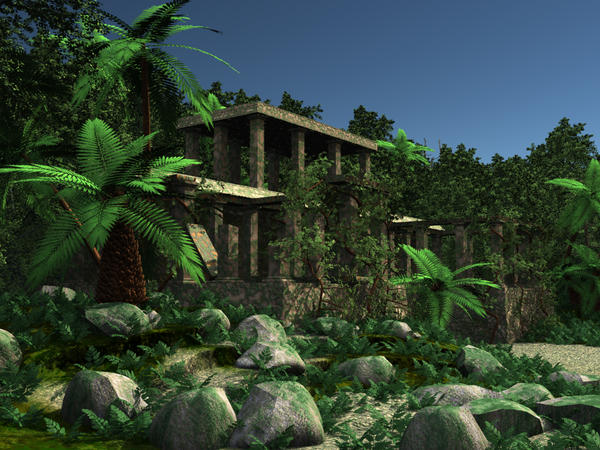 I inserted two different terrains and used a mountain generator, a terrace filter and a zero edge filter on them and placed them to either side of the temple ruins. I then replicated some ferns and boulders on them. I manually placed trees onto these terrains, and these trees were then added to the jungle replicator.