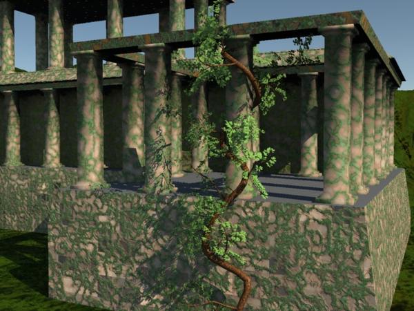 I tried the Ivy Generator and couldn't get the look I wanted. I inserted an empty vertex object and opened it in the Assembly room. There I drew a poly line and wrapped it around a pillar. Then I drew a rough circle shape and extruded it along the poly line and smoothed it. I tweaked the position a bit and then selected various polys along the length and set made those a separate shading domain.