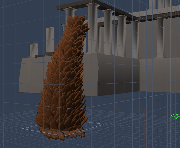 I altered the palm tree to make another jungle-like plant. I've altered the trunk settings to make it short and squat. I altered the leaf size and angle, I altered the trunk and leaf shaders. I wanted a very rough bark, and the best way I found to do this was by creating a very simple vertex object and then using a surface replicator confined to the palm's trunk domain to replicate my vertex bark on the palm.