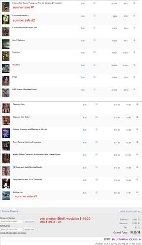 However, if you are on a limited budget, and these buy this-this-this are the norm, the stacking discounts won't be as beneficial. That seems to be the trend and I'm hoping there are some good flat discounts that stack. (Take note, DAZ) :)