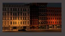 the second set of buildings are done with a faceted mesh that's knocked out and bridged for the windows.
