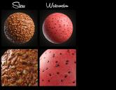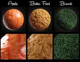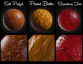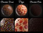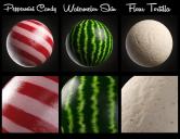 Hello all! Well, it's finally finished. I addressed several of the requested shaders, but--alas--there was just no way I could do them all, so if you don't see one you really wanted, look for it in the sequel. blush There are a lot of little special features to these shaders. For instance, Ice cream, Frosting, and Citrus skin all have no image in their base color channel, allowing you to change their color to your hearts content. You could make black ice cream, if you so desire. Or polka dot frosting. The apple shader has an aging texture stored in its normal and displacement maps, that allow you to whither and age your texture. Hamburger's greasiness is controlled with the top coat layer. A lot of the shaders like Ice cream, Hamburger, Bread crust and Frosting; have textures that change their looks dramatically when you change tiling, and a lot of looks are possible.