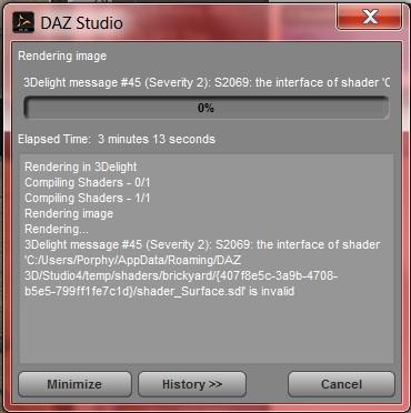 3Delight message #45 (Severity 2): S2069: the interface of shader 'C:/Users/Porphy/AppData/Roaming/DAZ 3D/Studio4/temp/shaders/brickyard/{407f8e5c-3a9b-4708-b5e5-799ff1fe7c1d}/shader_Surface.sdl' is invalid