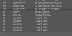Hope my export window helps in attached images...Top two outfits are fairly triangle heavy, third OK. The guns are by Dekogon so low poly as they are sold on Unreal Store too.