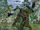 I was playing with Raven Mocker today and then loaded Swampbeast over him. The Raven Mocker feathers were left behind and resulted in a happy accident where I discovered that the feathers work on other characters, too. So then of course, I had to add some ravens the the mix. This is the result.