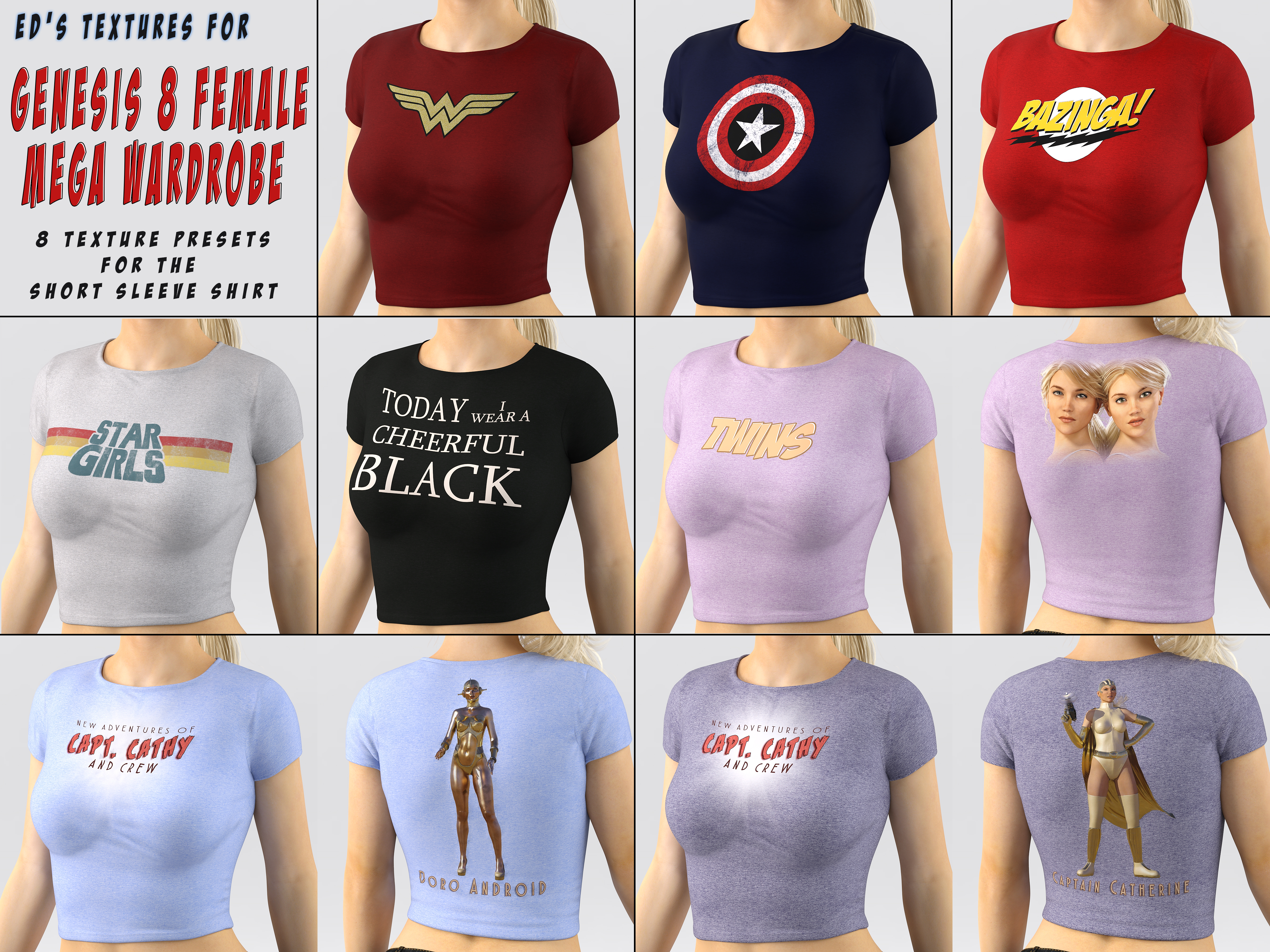 8 textures for the Short Sleeve Shirt from 'Genesis 8 Female MEGA Wardrobe'.
