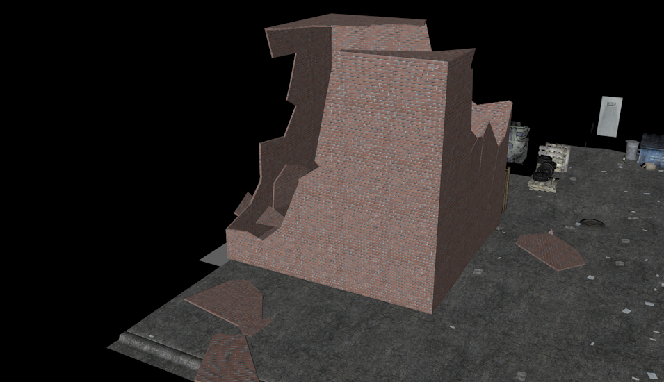 If you want destroyed buildings, you'll want to spend a little time with a proper 3D modeling program, like Blender. You don't have to be a very advanced user to do things like this: