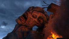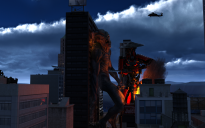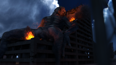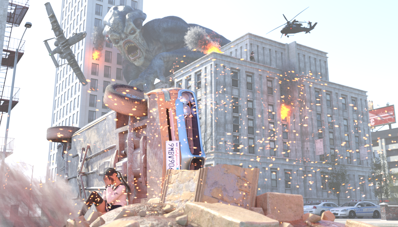 There is certainly alot going on in the shot. And that's one despicably ugly monster tearing up the city. The couple hugging on the roof is a story all on its own. If you are looking for ideas, Some cops at the crusiers with gun drawn shooting upward would be a possible addition. I generally rather have the protagonist's more active, so the girl sitting crying in the foreground could instead be crouched and moving away from the mayhem, but it's your story, and there maybe a good reason for her to be that passive. The haze helps with the scale of the scene, but obscures the sky, you may consider to try a different more intense skymap to allow some clouds and sky details to cut through the haze.