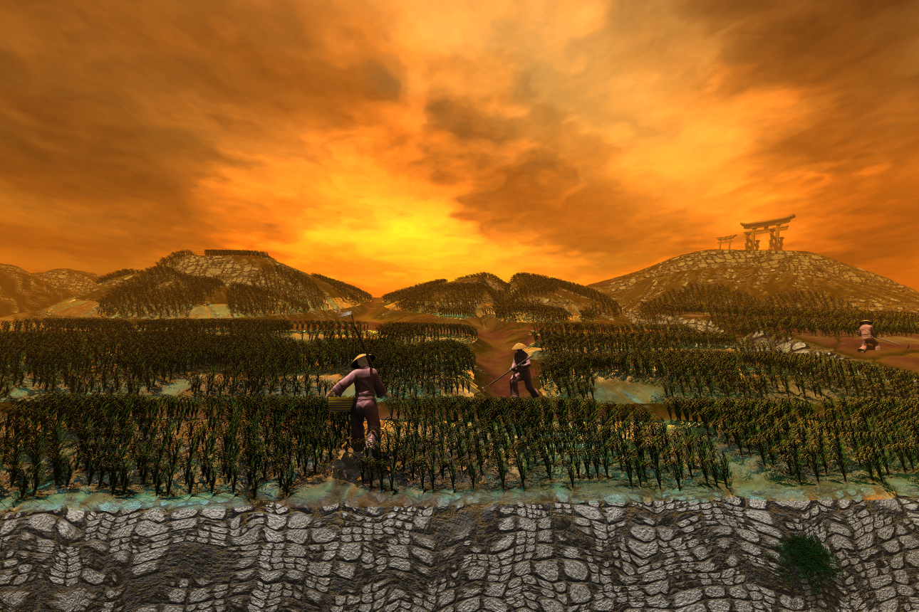 akmerlow: Wonderful to see a non-Western rural scene. Both are very nice and the instancing worked well, I think. I prefer the daylight one, because in the sunset one I thought the rows of vegetation were one hedge instead of a field. After seeing it better in the daylight one, I was also able to see my mistake in the sunset one.