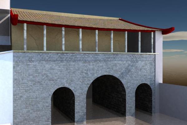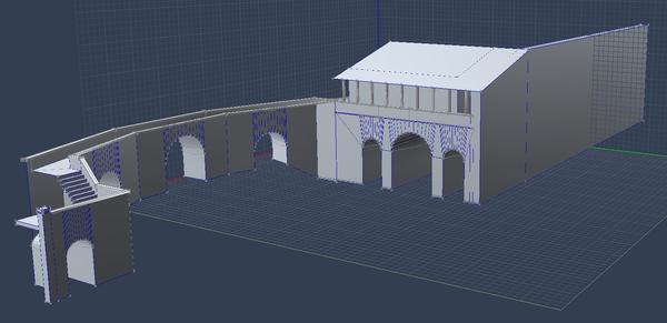 It's shown up that I need to add in facing stones around the arches, & I need to figure out scaling - when I added the same texture to the next bit of the model on the left, it came out completely different. I think if you size the UV bigger than the grid in the editor, the texture sheet just repeats, yes?