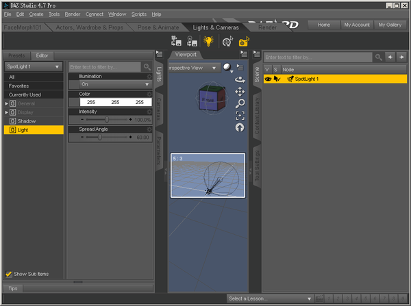 And a glimpse at some of the settings, at there defaults, for the "DzSpotlight". I have yet to look at the other two (dzDistantLight, dzPointLight).