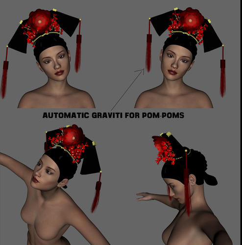bellow is the technical extra for the automatic gravity , when you pose the head front back side to side the pompons will fall with the gravity , also great for animation or dancing poses .. to go with the flow .. as they was consider this little detail as a beauty for the reason they hang it on the head decor