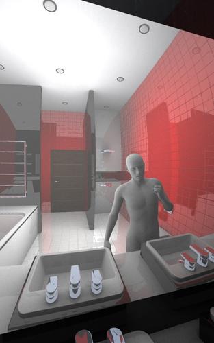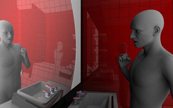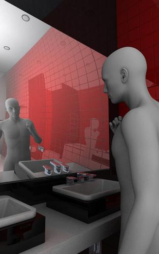 First shot is us viewing him on a side view..... second shot is viewing him from 'inside' the mirror', and third is us looking over his shoulder into the mirror. Fourth is another angle shot, which would make use of two people stood peering into the mirror.... Lastly, a closeup shot, of him checking himself out, is shot at a 40mm focal length. Image size 800 by 500 pixels.
