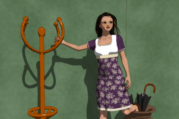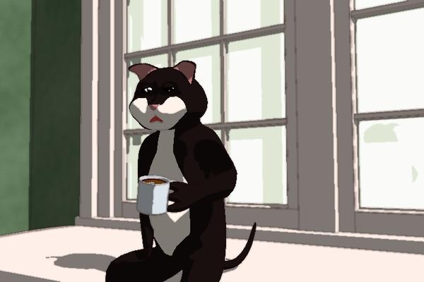 Well, here's a longer shot of the room with my cat drinking cocoa. I did some work on the textures to eliminate the bump, and to get rid of fine details in the shaders. They worked well without the 'toon filter, but when it is used it introduces noise and moire patterns. I still have some of that, but most of it is because apparently the 'Toon filter doesn't anti-alias no matter the AA settings in the render room, and I haven't found a setting in the filter control panel.