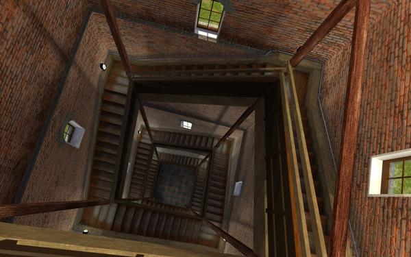 Here's a couple of interior renders, both with full GI (7 minutes to render on my laptop). The first has outside sunlight, and a lot of light spill from the room above (big windows) - you can see the well lit cross beam and the window sill at right. The bulkhead lights on the walls are only at about 30% and tinted slightly greed to give the effect of fluorescents. 20ft range with 50% falloff. The green is more noticeable lower down, as the walls are whiter (Take a bucket of whitewash and see how far up the tower you get!)