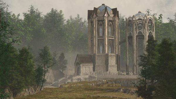 Here is a fun Kit-Bash of the Badlands Canyon base with a Woodlands terrain shader and two (with duplicates) Woodlands Objects elements from the Nature category. The enormous "Elven Temple", by Cornucopia 3D, fills most of the gorge in that base preset, and I lovehow the ground fog plays into all of that. On this tiny laptop, it was a guessing game as to how it would turn out. I've used some of the shader techniques that I've picked up from PhilW's Realism Rendering on the temple, but the shaders come in from the Poser Runtime pretty well set up, so it was a short and quick affair there. I also brought one of the volumetric clouds down onto the temple area, made some adjustments, and set it (as a new master) to be affected by all lights.