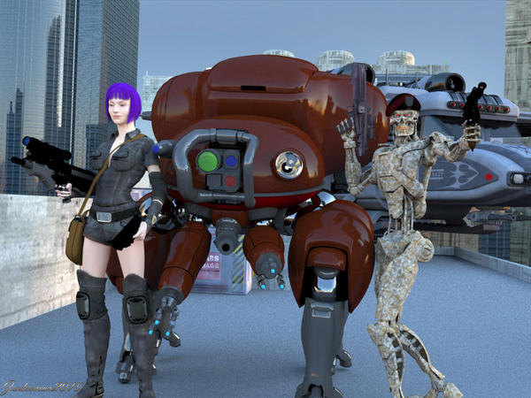 And the Gal next to it (based on a certain likeness; free Paris hair and Motoko hair morp export for V3 from sharecg was another fun learning experiance converting to Genesis2 triax autofit in studio)- is a Genesis 2 Fem, and for some reason nomatter what, I shaped, clothed and posed her in Studio, saved as a scene subset, the mesh just didn't want to comply with the rigging when imported into Carrara for some reason. Tried all sorts of things and while the "guns" were in the proper posed position, along with the skeletal rigging, the arms and body were stuck at the base default pose. Could move the rigging for the arms and the guns moved with it but not the actual mesh...