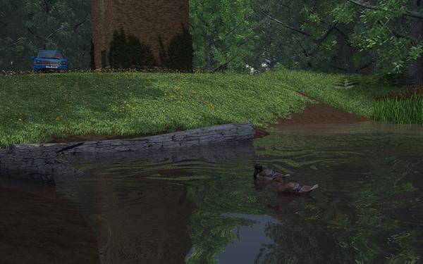 I did a render overnight using Howie's water shader from Stoney Creek. I won't post the render here - the water was more or less just a mirror with a hint of ripple. But it took 7 hours to render, so I guess that's the ballpark render time for a 'pro' shader. Anyhow, by hiding all the vegetation I can get a render out in 7-10 minutes, so that's what I shall do for the purposes of shader tweaking.