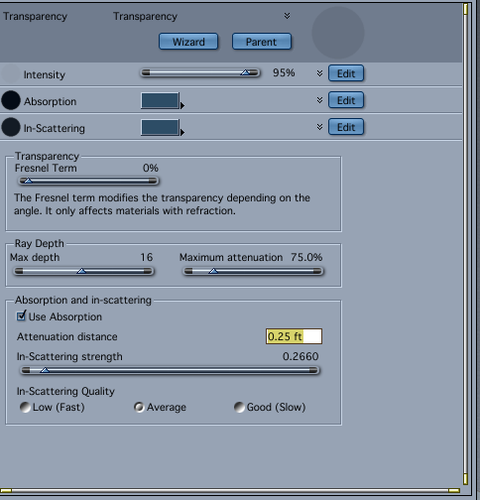 You can also enter what's called an Attenuation factor. That describes how deeply the light goes into the object before it bounces back out into your eyes, or gets totally absorbed. That's why deep water appears semi-transparent, and the deeper you go the less you can see of the submerged object.