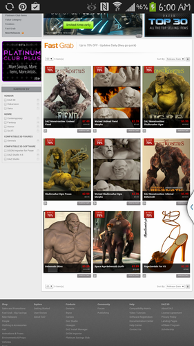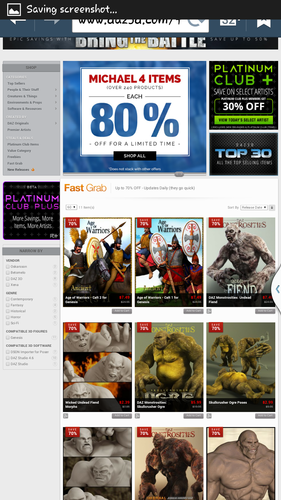 Thinking on it, though, I imagine that a lot of the PAs aren't willing to put products in Fast Grab at the same time they're participating in PC+ or some of DAZ's other marketing brainstorms. Stack 30% off on top of 70% off and then add in one of the store category sales and... well, at some point you're going to end up having to pay the customers to take your products.