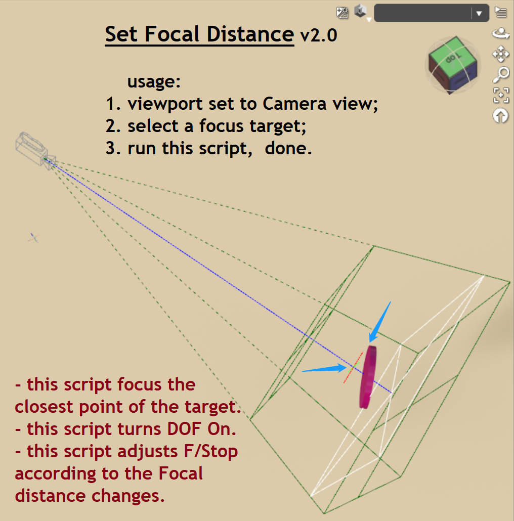 This script turns DOF On, otherwise the Focal Distance is meaningless. This script adjusts F/Stop a little bit according to the Focal distance changes for blur effect.
